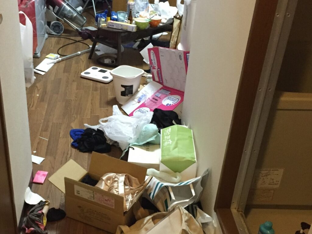 ご依頼主は、千葉県・船橋市にお住まいの30代の女性。小型犬と猫を飼われており、室内で一緒に生活をされていました。当初はこまめに掃除や片付けをしていたそうですが、仕事の多忙さや生活の疲れから徐々に物が増え始め、気づけばリビングや寝室、トイレ・浴室までもが物であふれた「汚部屋状態」になってしまったそうです。